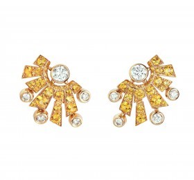 SoleilByzance系列以灵动舒适的连结设计生动展现了如火如丹的赤日光芒。两枚戒指化身为两束光芒顺着指尖延展,一束镶嵌了2.96克拉的梨形切割黄钻,另一束则以黄K金、铂金镶嵌黄钻打造,重达3.68克拉鲜艳而热烈的梨形切割红宝石锦上添花。耳畔,两颗枕形切割的黄钻引领着两道光芒,星星点点的白色钻石零星散布其间。