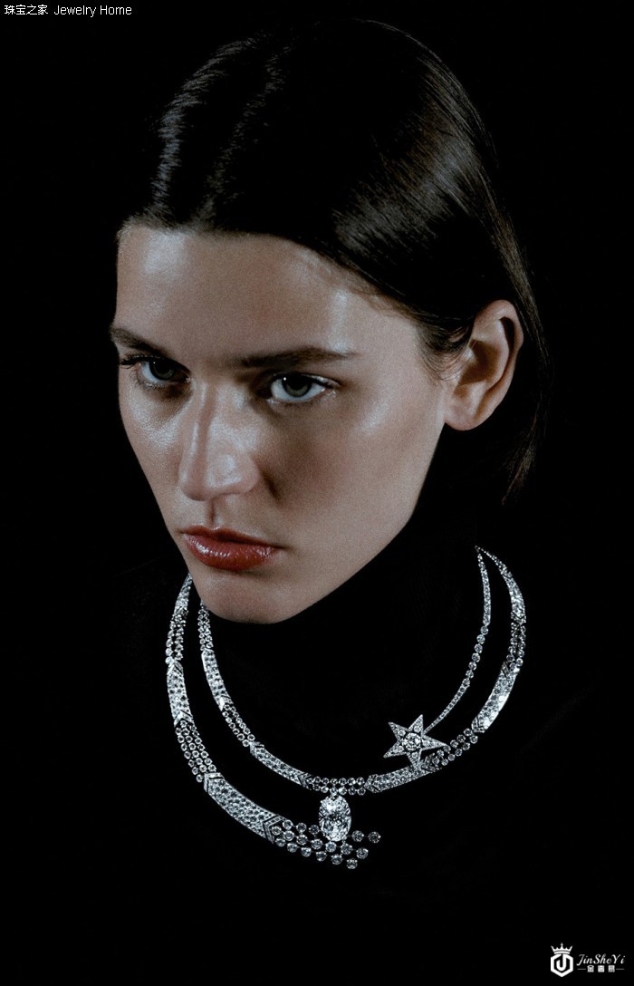 这是巴黎的一个夏夜,天气尚未转凉。如果不是流星划过,夜空应该是墨黑色,如同一幅黑色的画布,被一轮新月的光环点亮。闪烁的星星犹如飘浮夜空的璀璨钻石,这一幕化作了这次展览的灵感源泉,日后亦成为香奈儿臻品珠宝创作的基石。香奈儿女士仰望着广阔夜幕中闪亮的星星,决定将瀑布般的流星,明亮的新月和夺目的太阳装点在女性的头发与身体上。
