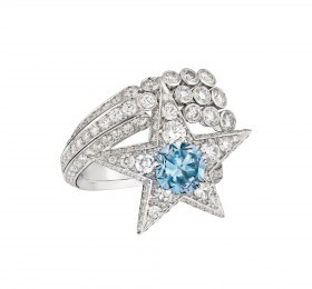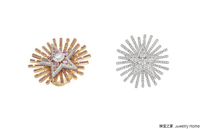 ComèteAubazine戒指点缀了白钻与粉色蓝宝石,ComèteAubazine胸针则镶嵌了精美白钻,彗星主体可与环绕四周的光环分离,单独佩戴。