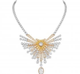 LuneÉtincelante系列则是向令人心驰神往的月之光致敬:弯月造型的项链上镶嵌着一颗重达5克拉的圆形切割钻石,环绕四周的光晕逐渐蔓延在肌肤之上。胸针以日月同辉的创意迎来白昼与黑夜的相遇,在太阳的辉映下,一颗6.18克拉的Ila型DFL级榄形切割钻石在皓月上大放异彩。
