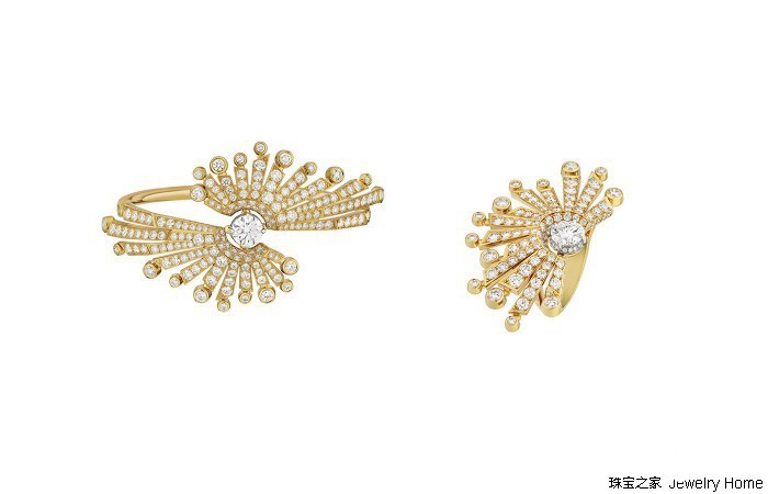 镶满了圆形切割钻石的SoleilGansé短项链、戒指、耳环和手镯,捕捉了地平线上旭日初升的瞬间与夕阳西斜的绮丽。