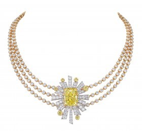 在白K金、黄K金、白钻与黄钻的交相辉映下,一颗22.10克拉枕形切割的艳彩黄钻无疑是Soleil19Août项链的点睛之笔,令整件作品璀璨卓绝。这颗耀目的华美宝石可以被单独拆下,作为戒指佩戴。