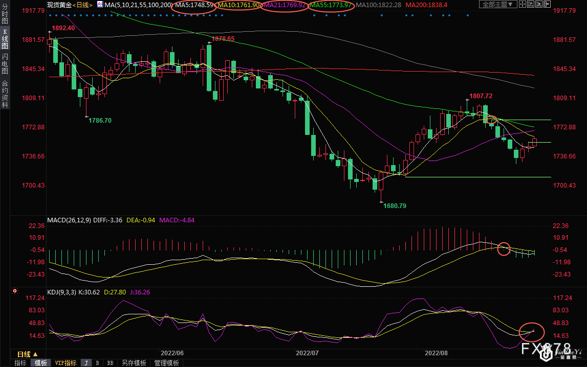 周四(8月25日)亚欧时段,现货黄金小幅上涨,一度升破1760关口,创一周新高至1761.55美元/盎司,美元指数大跌远离逾20年高点,给金价反弹提供机会,不过,市场仍普遍关注周五的杰克逊霍尔全球央行年会,美联储主席鲍威尔将发表讲话,市场预期偏向鹰派,而且目前利率期货显示,美联储9月份加息75个基点的概率已经上升至61%,这或将限制金价的上涨空间,在顶破10日均线1761.91前,仍需提防金价重回跌势的可能性。 本交易日关注美国初请失业金人数变动和美国二季度GDP修正值的表现,留意堪萨斯城联储主席乔治的讲话,留意地缘局势相关消息。 日线级别:震荡;均线交织,KDJ重新结成金叉,MACD死叉信号仍在,短线走势变数较大,目前金价正试探布林线中轨和10日均线的双重阻力,大约在1761.9附近,若能站稳该位置,则增加短线看涨信号,进一步阻力在21日均线1769.94附近,55日均线阻力在1773.98附近,8月16日高点阻力在1783.04附近。 如果金价持续受到10日均线的压制,仍需提防金价重回跌势的风险,周三高点支撑在1755.72附近,5日均线支撑在1748.61附近,若回落至该位置下方,则增加短线看空信号;周三低点支撑在1742.32附近,周一低点支撑在1727.69附近,强支撑在布林线下轨1711.07附近。
