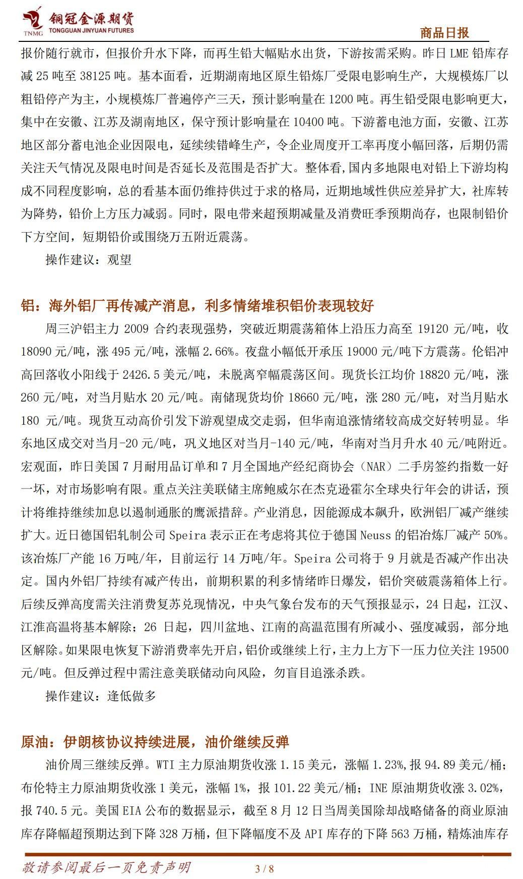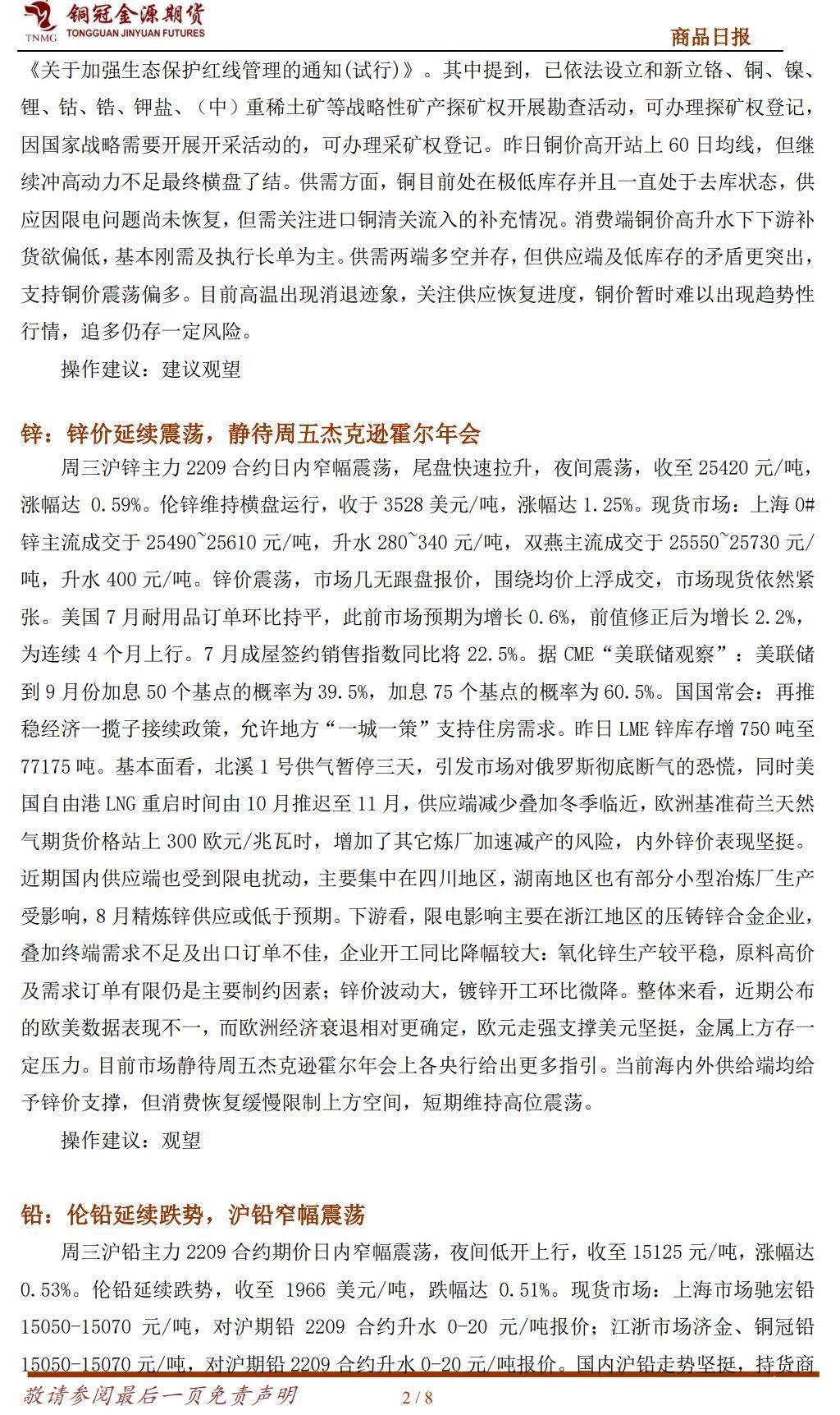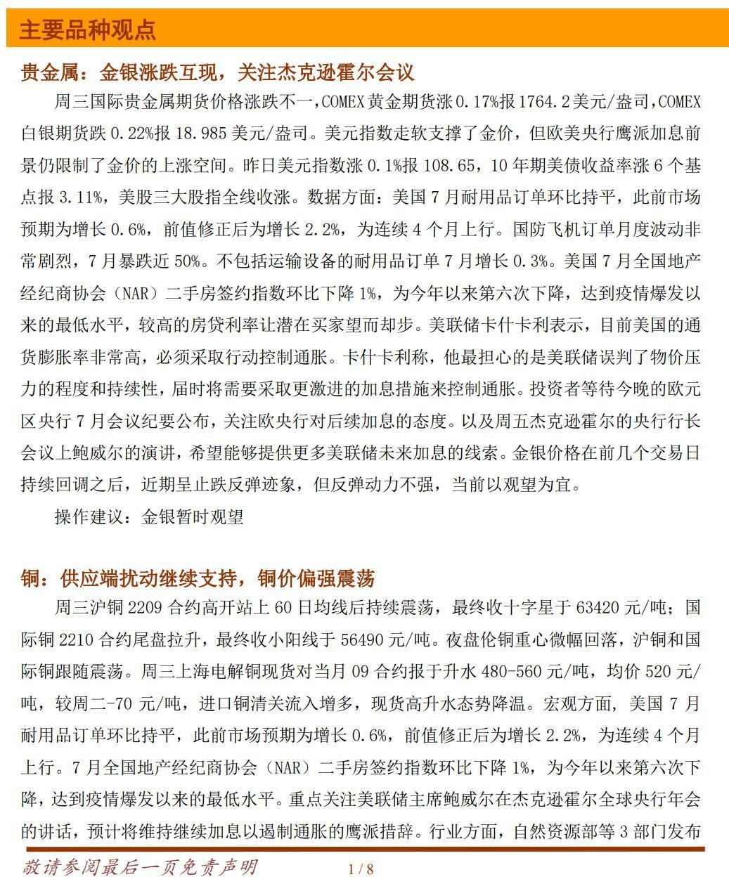 贵金属:金银涨跌互现,关注杰克逊霍尔会议 周三国际贵金属期货价格涨跌不一,COMEX黄金期货涨0.17%报1764.2美元/盎司,COMEX白银期货跌 0.22%报 18.985 美元/盎司。美元指数走软支撑了金价,但欧美央行鹰派加息前景仍限制了金价的上涨空间。昨日美元指数涨 0.1%报 108.65,10 年期美债收益率涨 6 个基点报 3.11%,美股三大股指全线收涨。数据方面:美国 7 月耐用品订单环比持平,此前市场预期为增长 0.6%,前值修正后为增长 2.2%,为连续 4 个月上行。国防飞机订单月度波动非常剧烈,7 月暴跌近 50%。不包括运输设备的耐用品订单 7 月增长 0.3%。美国 7 月全国地产经纪商协会(NAR)二手房签约指数环比下降 1%,为今年以来第六次下降,达到疫情爆发以来的最低水平,较高的房贷利率让潜在买家望而却步。美联储卡什卡利表示,目前美国的通货膨胀率非常高,必须采取行动控制通胀。卡什卡利称,他最担心的是美联储误判了物价压力的程度和持续性,届时将需要采取更激进的加息措施来控制通胀。投资者等待今晚的欧元区央行 7 月会议纪要公布,关注欧央行对后续加息的态度。以及周五杰克逊霍尔的央行行长会议上鲍威尔的演讲,希望能够提供更多美联储未来加息的线索。金银价格在前几个交易日持续回调之后,近期呈止跌反弹迹象,但反弹动力不强,当前以观望为宜。 操作建议:金银暂时观望