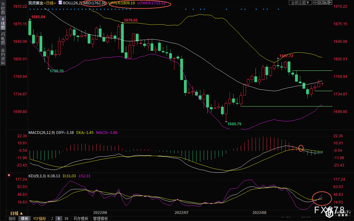 周五(8月26日)亚欧时段,现货黄金窄幅震荡,目前交投于1756.66美元/盎司附近,临近美联储主席鲍威尔在杰克逊霍尔年会上的讲话,市场仍普遍预期鲍威尔将会发表鹰派措辞,美元震荡走高,收复了周四的部分跌幅,虽然目前金价还受到一下地缘局势引发的避险买盘支撑,但整体来看,金价后市略微偏向震荡下行。 除了美联储主席鲍威尔的讲话,投资者还需留意美国7月PCE数据的表现,并留意其他国家央行官员的讲话,留意地缘局势相关消息。 日线级别:震荡;MACD轻微死叉,KDJ轻微金叉,均线交织,短线走势变数较大,鉴于金价目前还承压于布林线中轨下方,后市仍略微偏向震荡下行,初步支撑在5日均线1750.25附近,8月24日低点支撑在1742.32附近,若回落至该位置下方,则增加短线看空信号。进一步支撑在本周低点1727.69附近,布林线下轨支撑在1715.51附近。 上方初步阻力在布林线中轨1762.34附近55日均线阻力在1771.86附近,若能顶破该阻力,则增加短线看涨信号;进一步8月16日高点1783.04附近,然后是1800关口阻力。 布林线轨道逐步收口,中线走势参考布林线轨道1815.52-1809.19区域突破情况。