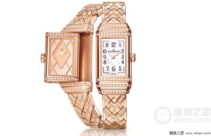 积家Reverso One Duetto Jewelry 双面翻转系列珠宝腕表玫瑰金款糅合大工坊的高级珠宝与高级制表工艺,为女性呈献一款完美平衡艺术设计和功能性的珠宝杰作。此腕表从装饰艺术汲取灵感,长方形表盘、背面表盘的菱形图案,以及18K 玫瑰金表链的设计,其线条细致修长,展现高雅的女性魅力。此外,表盘上、下均采用标志性的三道装饰刻纹,令这款可翻转的腕表更具特色。装饰艺术风格自诞生起一直引领时尚,历久常新。这款典范之作完美诠释了装饰艺术风格的简约设计哲学。