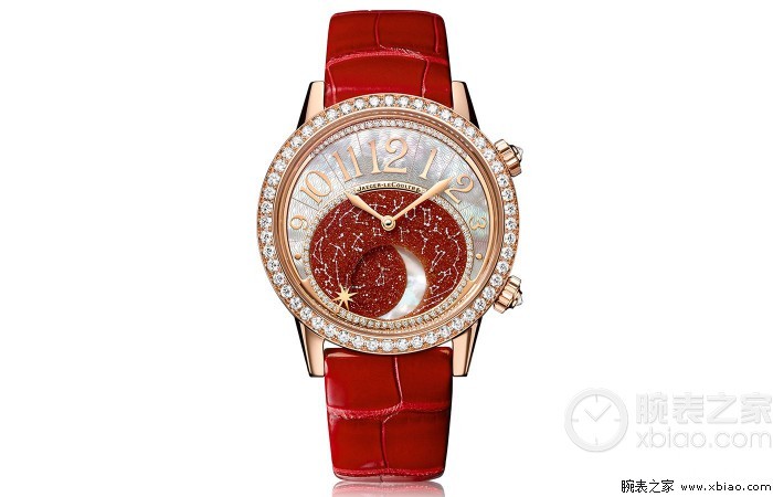 积家Rendez-Vous Moon约会系列月相腕表玫瑰金款呈现奔放热情的迷人魅力,精致闪耀的表壳宛如一曲献给璀璨夜空的颂歌。腕表以无限诗意展现大工坊制表大师的精湛技艺,浩瀚缥缈的星空图案镌刻于腕表之上,令人沉醉。热情的火光色彩“铺满”玫瑰金表壳之上,紫红色砂金石表盘呈现北半球的浩渺苍穹。表盘和表壳均以钻石镶嵌,流光溢彩。珍珠母贝打造的一弯明月在浩瀚星空中缓缓移动,与显示数字时标的表盘采用相同工艺打造,散发皎洁光彩。一枚星形指针,以最富诗意的方式提示着佩戴者下一个约会的时间。