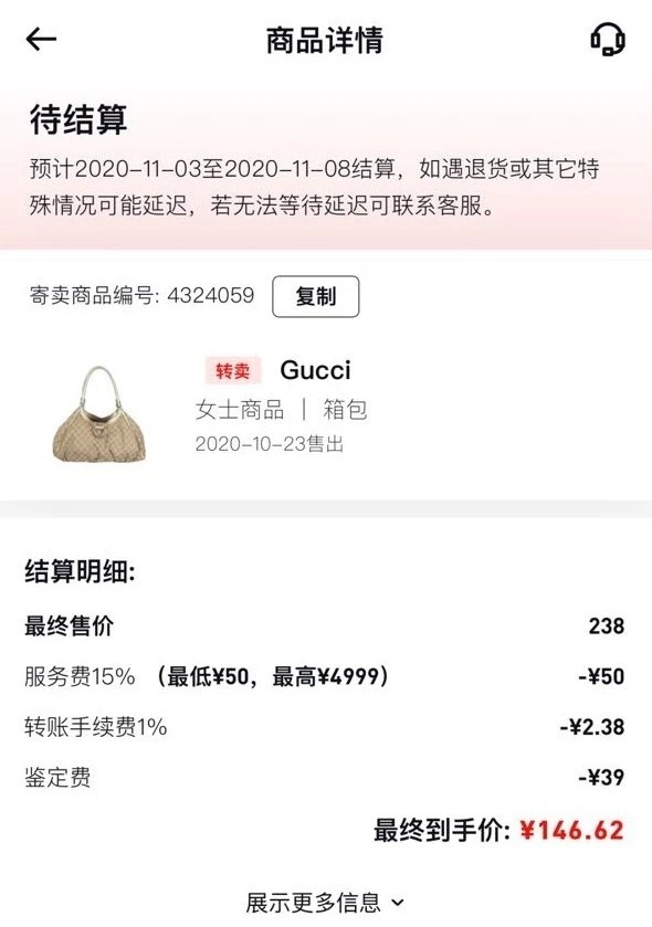 10月22日,页面显示鞋子已经在平台上架,但牛仔外套还没有被验收。两天以后,该用户发现牛仔外套已经在22日当晚以600元的价格被售出,扣除服务费后的所得只有500元。