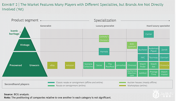 市场的细分为奢侈品牌和零售商创造了机会。比如,在线交易平台(如 eBay)和转售公司(如 Jomashop)具有强大的运营能力和电子商务,以及较高的交易量和库存量;还有许多在线玩家(如Watchbox,Watchfinder 和 Chrono24 等)则将重点放在价格较高的二手商品上。