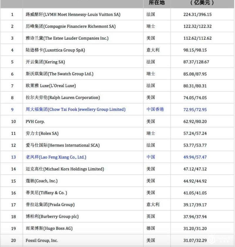 2017年度全球前20位奢侈品集团(图片来自时尚中国)