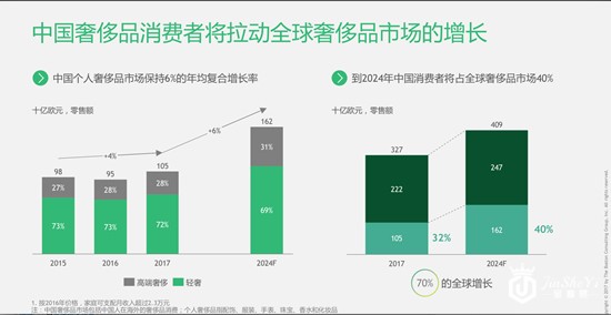 报告指出,到2024年,中国个人奢侈品市场的复合年增长率达到6%,中国消费者将贡献全球奢侈品市场40%的销售,带动全球市场75%的增长。