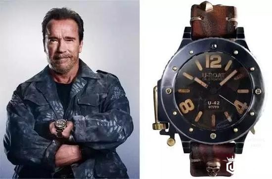 除此之外,施瓦辛克在电影中还佩戴过小众品牌 U-Boat 的 Unicum U-42 潜艇主题腕表。这款腕表经过特殊处理,表壳经过黑色涂层加工,加入部分青铜,采用钛合金打造,非常具有复古味道。