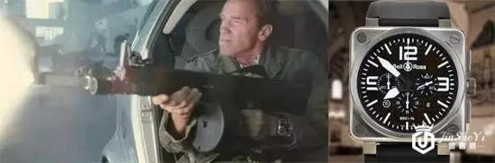 当然,叶子肯定不会忘了另一经典银幕硬汉 阿诺德·施瓦辛格。虽然施瓦辛格在《敢死队》中的戏份不多,但每一次出场都是可圈可点的。在飞机上火力支援这一幕,他佩戴的 Bell & Ross BR01系列时计码表。Bell & Ross 是来自瑞士的腕表品牌,这款腕表采用了蓝宝石水晶材质打造镜面,并进行了防眩处理,正方形的表盘,以及四角上的锁牙螺丝设计都非常粗旷阳刚。