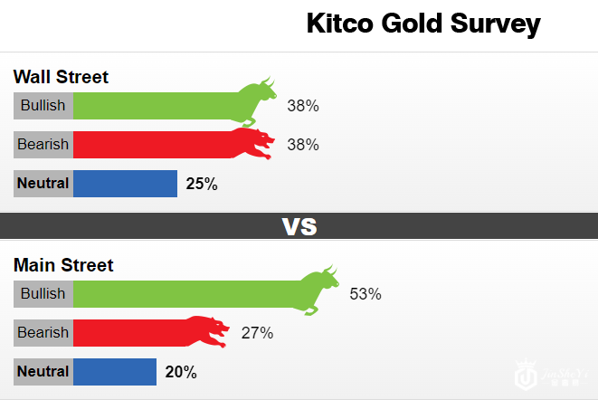 此种形势下,Kitco黄金周度调查结果显示,华尔街对下周金价的看法分歧较大。在参加调查的16名分析师中,持有看涨或看空预期的分析师各有6人(38%),4名分析师(25%)对近期金价持中性看法。