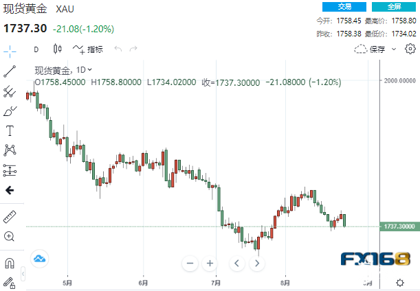 美市尾盘,现货黄金收报1737.30美元/盎司,下跌21.08美元或1.20%,日内最高触及1758.80美元/盎司,最低触及1734.02美元/盎司。本周,现货黄金下跌9.58美元或0.55%。