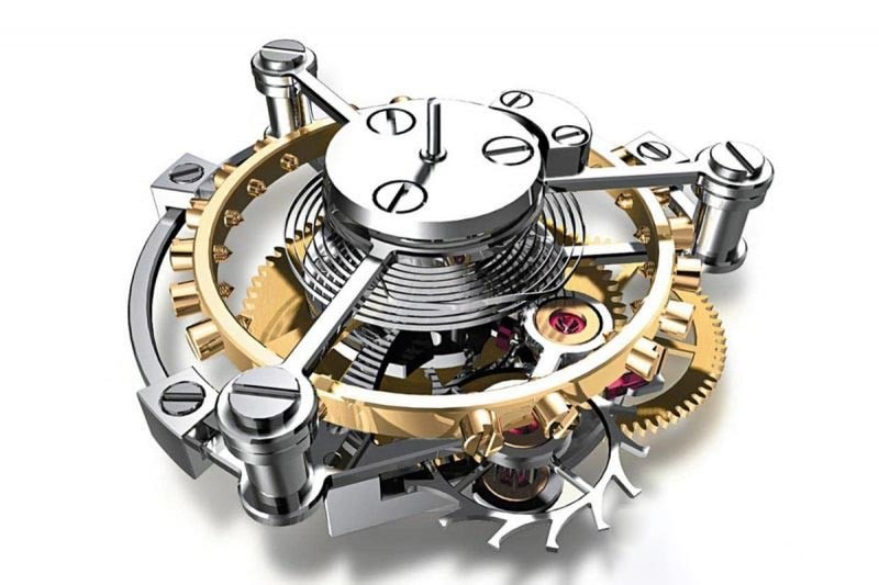 宝玑陀飞轮结构。早在怀表时代,由于摆轮与游丝因受到地心引力的影响,速度会产生变化,游丝的形状可能因重力拉扯而变形,影响到走时的精准性。因此宝玑大师就想出了将摆轮、擒纵装置放在一个框架内,以一分钟的速率旋转一圈,让游丝不会仅受单一方向的力量影响,平衡不同方位所产生的走时误差,是相当聪明的概念。
