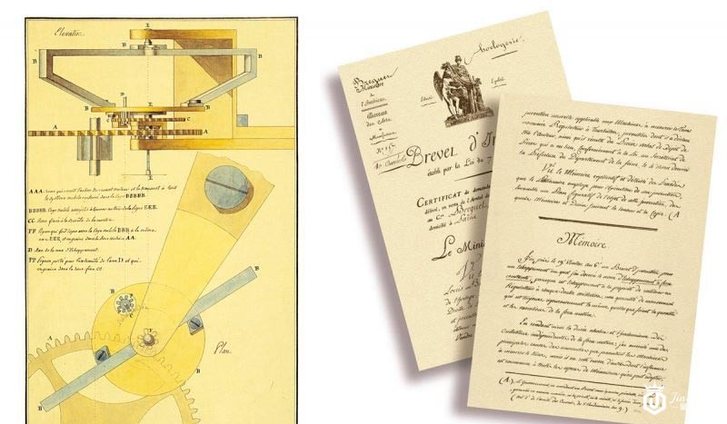 陀飞轮设计草图(图左)与陀飞轮专利权证书。这项概念在1795年被绘制成设计图,但由于仍有许多技术需要克服,包含框架零件的制作,以及配重都要进行测试。经过了两轮实验,宝玑先生使用了282型机芯以及169型机芯制成陀飞轮怀表,其中169型机芯的陀飞轮怀表还在1809年赠送给另外一位制表大师约翰.亚诺(John Arnold)的儿子。陀飞轮要到法兰西共和9年获月7日(Brevet du 7 Messidor An 9),也就是1801年6月26日这天才正式取得专利。