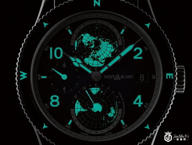 ▲为了配合这次蓝色的主题,表款连夜光的颜色都换成了蓝绿色,相当用心,而南北半球发光的大陆也很抢眼。虽然表壳采用了5级钛,不过考量到军表的设定,外装的表面处理仍然是以发丝纹为主。