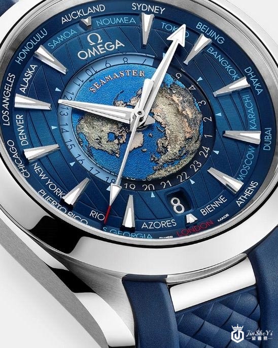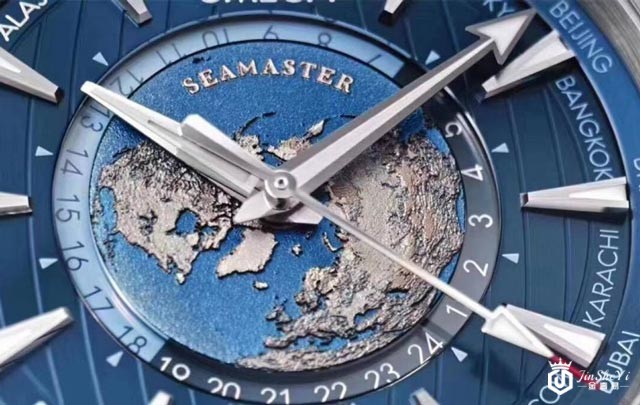 ▲包含做在地图上的SEAMASTER字样也是立体的,海洋则是类似梨地面的质感。城市环上的城市有蓝白两种颜色,其中白色的是有使用夏令时间的,另外Sedna Gold款是分成金色和深蓝色。