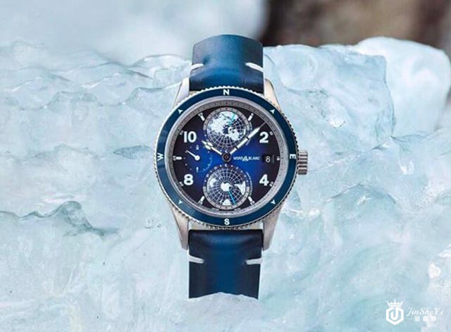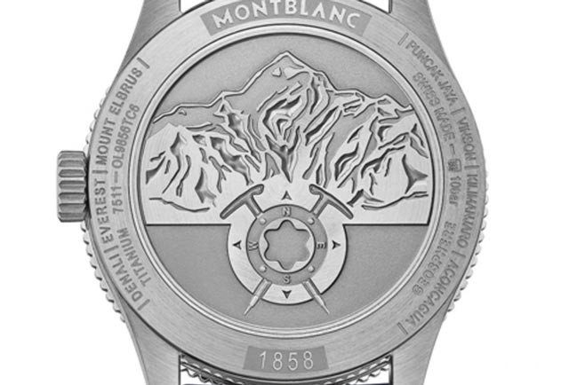 ▲表款搭载的MB 29.25机芯是由Sellita的SW300加装时区模组而来。表背采用实底盖,上面装饰有白朗峰、罗盘和冰镐等等图案,同样是在回应1858系列的主题。