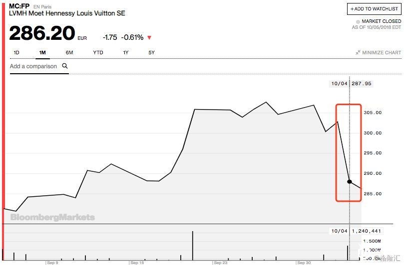 当地时间本周四开始欧洲奢侈品公司出现近月以来最大跌幅。路威酩轩(LVMH)股价下跌3.7%,巴宝莉(Burberry)股价下挫4.3%,古驰(Gucci)母公司——法国开云集团(Kering)的股价也跌至435.7欧元,相较于7月峰值的522.4欧元已下挫5.8%。