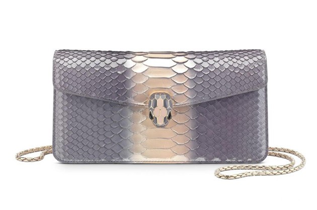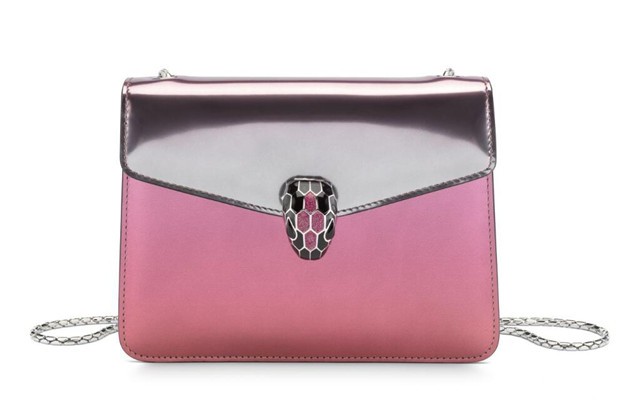 降解处理工艺已经成为宝格丽一个经典。它通过颜色组合捕捉时尚动向。精致却又不古板,款式经典却又个性十足,本款Serpenti Forever Bicolor Glam Python翻盖肩包为我们呈现了一个完美的色彩转换秀。为得到降解效果,皮面先经由Rhapsody Opal色彩染色,当第二次染上中央水晶玫瑰光泽时,将皮面上较大鳞片染上明亮色调。最终呈现明暗对比效果明显的闪亮包面外观,而包内则采用亚光和珍珠装饰。