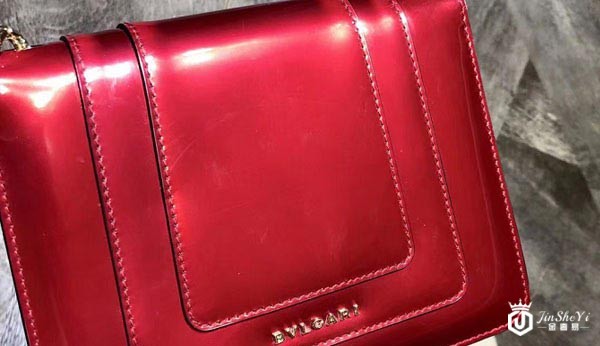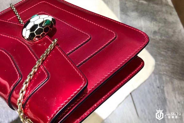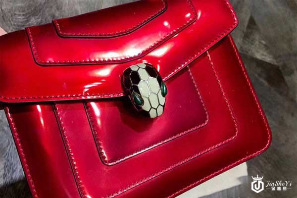 上图为宝格丽红色漆皮蛇头包包侧面实拍