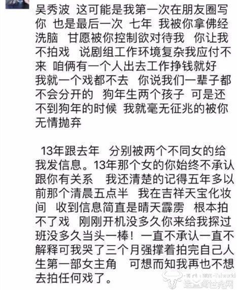 据了解,9月24日,女演员陈昱霖在朋友圈发了一篇长文,称自己与吴秀波的地下恋情长达7年,吴秀波用佛经给她洗脑,不让她出去拍戏,让她在家专心伺候自己。除此之外,陈昱霖还提到,在这7年里吴秀波还与两个女明星有染,此消息一出便迅速登上了热搜。