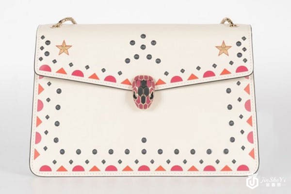 上图为宝格丽白色牛皮限量星星铆钉蛇头斜挎包