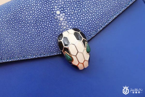 图为宝格丽宝蓝色蛇头包细节