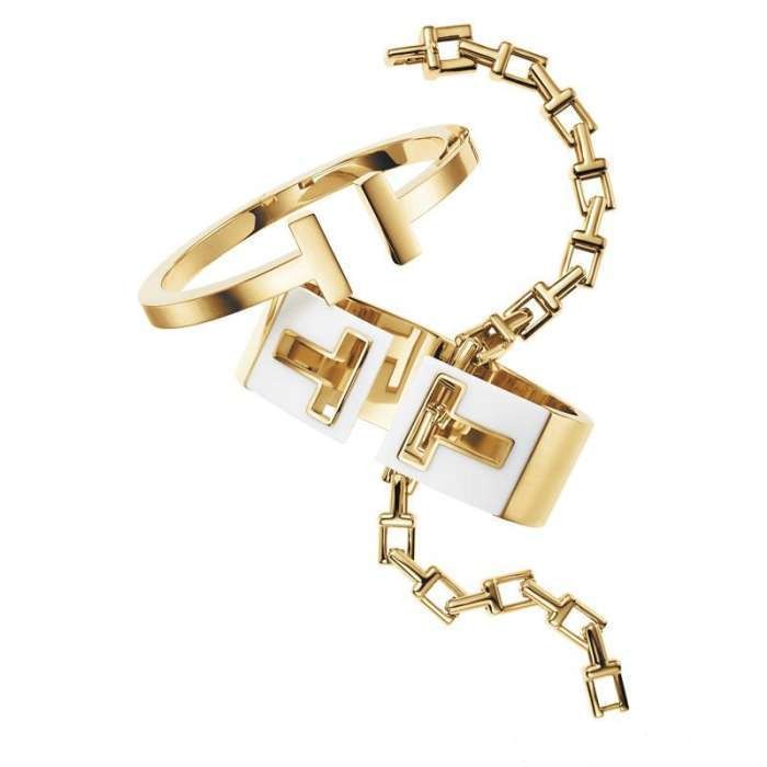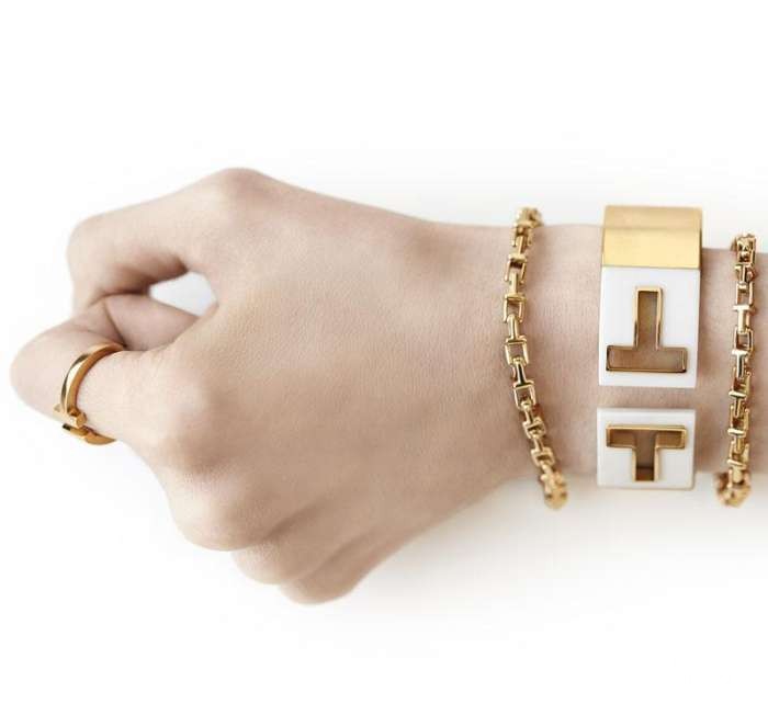 Tiffany T 18k黄金戒指;T字链结手链和搭配白瓷的开口宽型手镯。体现Tiffany T尽情摩登的自在叠戴风格