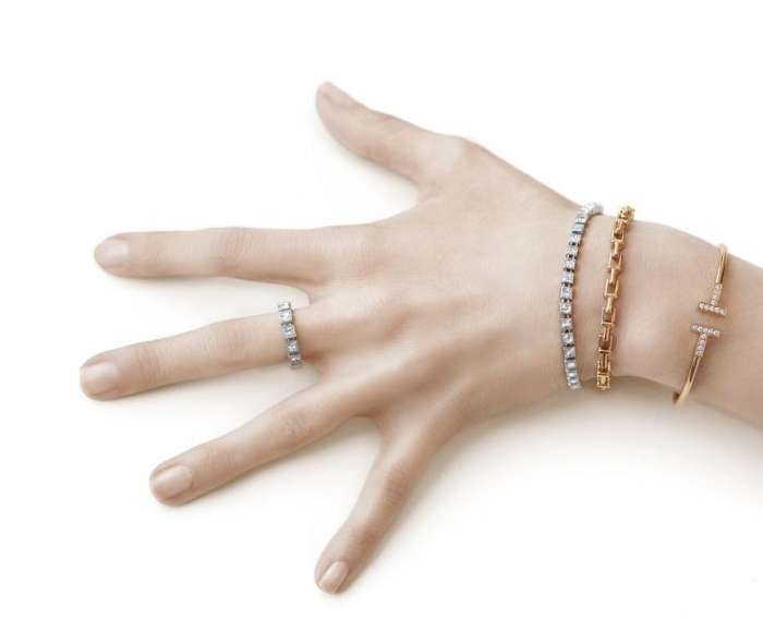 Tiffany T 18k白金镶钻戒指;18k白金镶钻手链;18k黄金T字链结手链;18k玫瑰金镶钻细款手镯。体现Tiffany T尽情摩登的自在叠戴风格