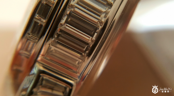 下面观察细节,高价值腕表一定是细节完美,材质高端的腕表,把头钻石相当完美,虽然是拼钻但折光率相当高。侧面是整颗方钻排列装饰。