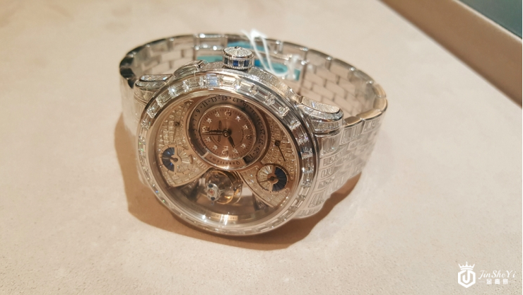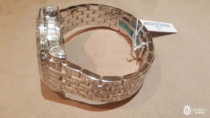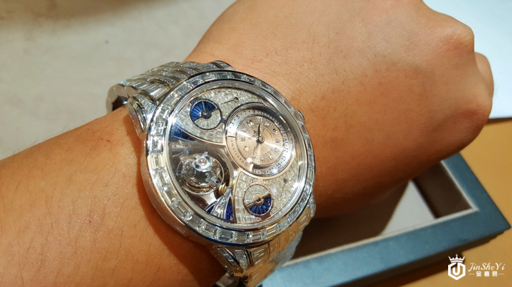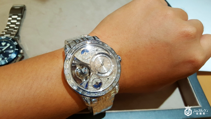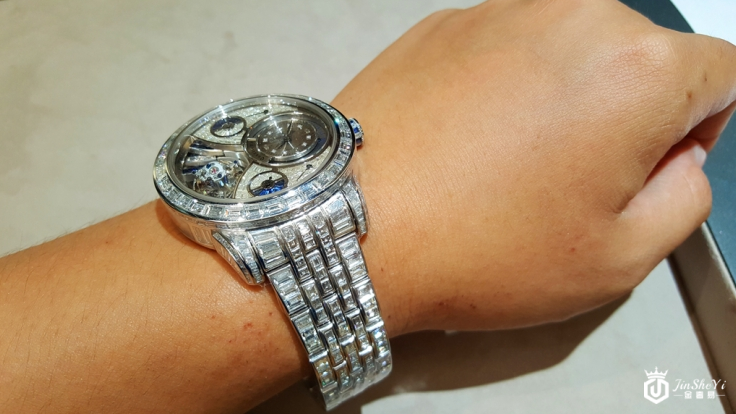 上手佩戴一下,一个字沉,本身白金材质就重于钢。在加上满钻更是增加了分量,刚佩戴时甚至都没抬起手臂,比想象中沉多了。不知道富豪们如何驾驭这么一只重表出席宴会的。转念又一想一千万啊,手上戴的是北京的一套住宅啊。