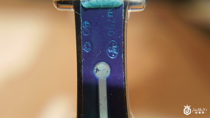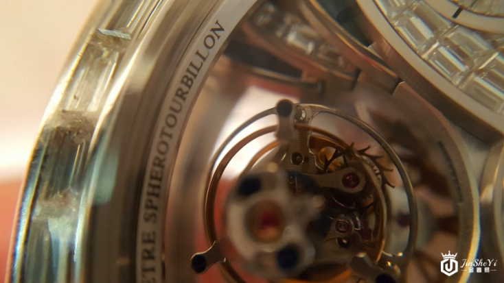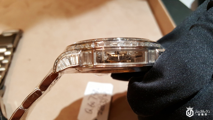 整只表带的材质也是采用白金,有贵金属标识,侧面采用蓝宝石镂空设计。机芯运行一览无余。