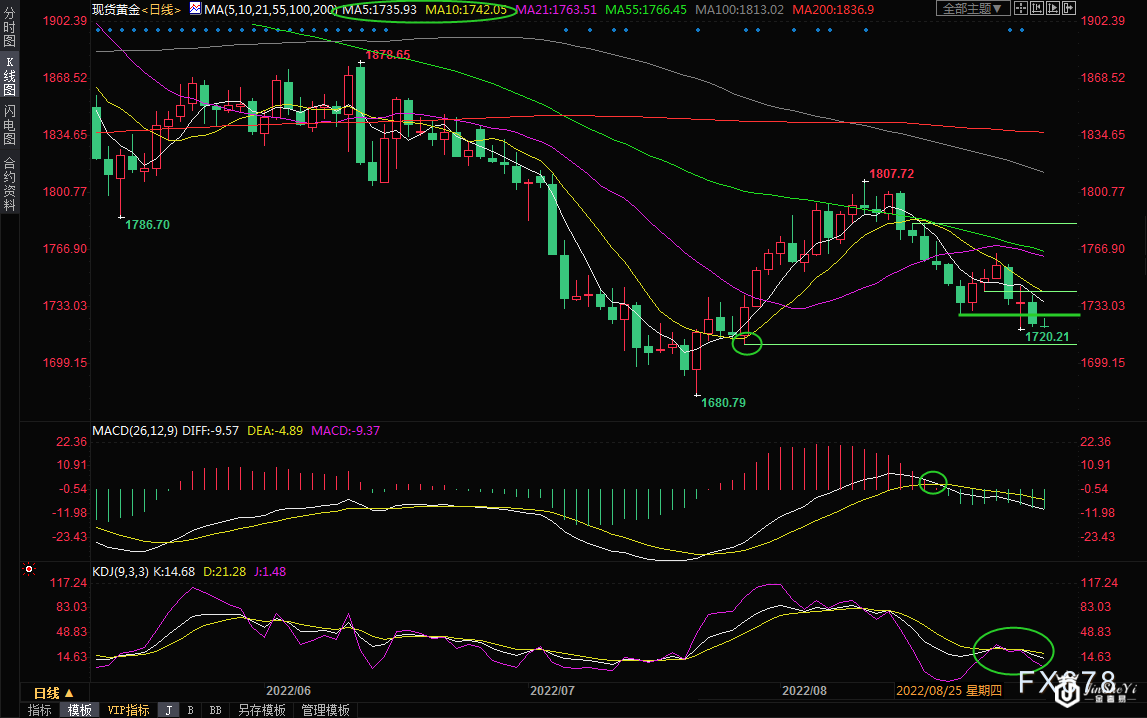 周三(8月31日)亚欧时段,现货黄金窄幅震荡,勉强守在1720关口上方,目前交投于1722.50美元/盎司附近,美联储和欧洲央行9月份均加息75个基点的预期,令金价持续承压,而且美元横盘于逾20年高位附近,打压多头信心。多数投资者等待晚间出炉的美国8月ADP数据,前两个月因故未公布的ADP数据也将同时出炉。有迹象显示,美国劳动力市场依然非常强劲,可能会进一步打压金价,技术面短线也偏向空头。 此外,投资者还需关注2022年FOMC票委、克利夫兰联储主席梅斯特的讲话,留意美国8月芝加哥PMI和地缘局势相关消息。 日线级别:震荡下跌;MACD死叉运行,KDJ向下发散,均线空头排列,短线偏向空头,初步支撑在周一低点1720关口,布林线下轨1717.05附近也存在一些支撑,较强的支撑在7月27日低点1711.38附近,若失守该支撑,则增加后市看空信号,进一步支撑分别参考1700关口和7月21日低点1680.79附近。 上方初步阻力在8月22日低点1727.69附近,5日均线阻力在1735.95附近,10日均线阻力在1742.05附近,因为目前金价尚未跌破布林线下轨支撑,若意外收复10日均线,则削弱后市看空信号。