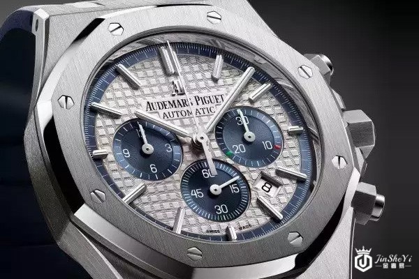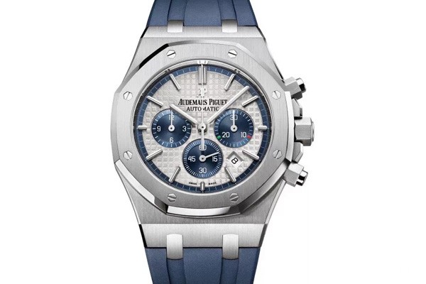 技术特色 – 爱彼皇家橡树系列计时码表限量发行500枚型号:26326ST.OO.D027CA.01机芯:2385型自动上链机芯;总直径26.20毫米(11?法分);总厚度5.50毫米;宝石数37;零件数304;保证非常低动力储存> 40小时;平衡摆轮振频3赫兹(每小时振动21,600次)表壳:精钢表壳,防眩蓝宝石水晶表镜,表底盖镌有“Swiss Made Limited Edition”(瑞士制造限量版)字样,旋入式表冠,防水深度50米;直径41毫米;厚度10.95毫米表盘:银色表盘镌刻“Grande Tapisserie”大格纹装饰,搭配蓝色计时码表盘,30分钟指针处计时盘装饰绿色、白色与红色刻度,镶贴式白金时标和白金荧光涂层的皇家橡树指针,蓝色外缘。表带:蓝色橡胶表带搭配精钢AP折叠表扣,以及手工缝制“方形大鳞片”蓝色鳄鱼皮表带。功能:时、分;小秒针设于6点钟位置;连续转动中央计时秒针,饰以意大利国旗颜色的30分钟计时盘(设于3点钟位置);日期