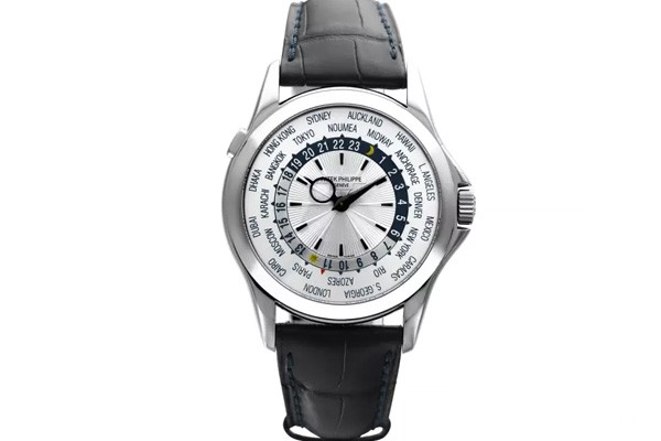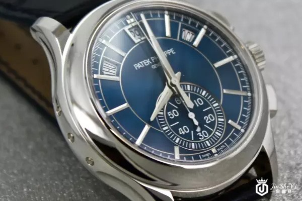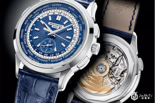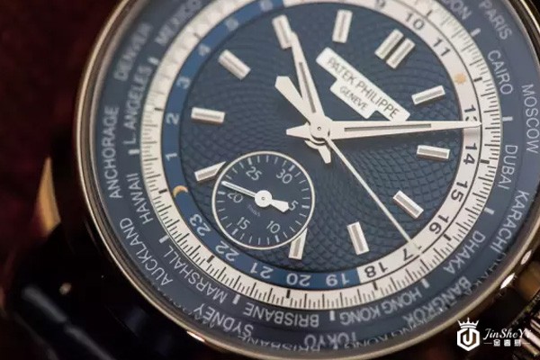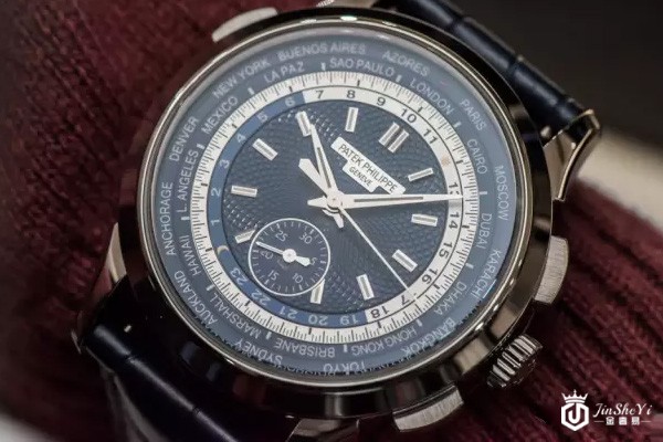 百达翡丽 Patek Philippe Ref. 5930世界时计时5930使用Cal.28-520HU自动上链机芯,直径33毫米,厚7.91毫米新壳型圆中有方,和之前5130的弧线曲面表壳相比多了一些直线,和被称作“小翼”(Winglet)的古典表耳、扁扁的方按键很搭,右侧是把头和计时的启停、归零按钮,左边10点位是世界时的前进按钮,正面看按键与表壳很搭,视觉上很从容,并无突兀。面盘是蓝色基调,细看是有三层,外圈是24时区城市,内圈是24小时带日夜的时间显示,再之内是和5110类似的玑镂纹表盘和12小时夜光刻度,6点位是30分钟计时。外圈与内圈之间白色60秒计时刻度圈非常醒目,但我觉得略有点多余,也许把60秒刻度再弱化一些,这个盘会更简洁,当然说起来容易做起来难,这也只是一说。总的来讲,无论从盘面针还是机芯表现,这个第一次,品牌是做了足够充分的功课。