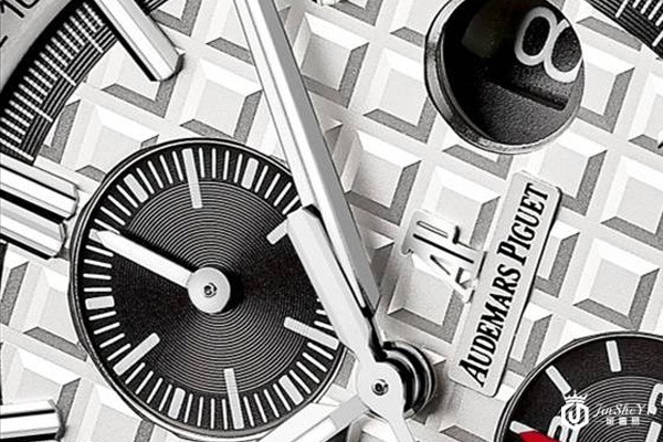表盘:3字位设有日期显示,12点钟小秒针显示,银色表盘镌刻“Méga Tapisserie”超大格纹装饰,搭配黑色计时器、白金荧光立体时标和皇家橡树指针及银色内表圈。