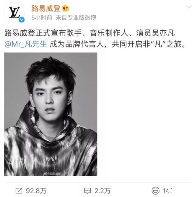 今日上午10点,奢侈品牌Louis Vuitton路易威登通过官方微博账号正式宣布90后明星吴亦凡为品牌代言人,也证实了近期粉丝内部传闻。吴亦凡在官方代言人照片中身着新任创意总监Virgil Abloh为Louis Vuitton创作的2019秋冬系列,吴亦凡出镜的宣传广告将在11月1日上线。该消息发布不到一日,相关微博转发已超过200万次,目前吴亦凡在微博拥有超过4390万粉丝。