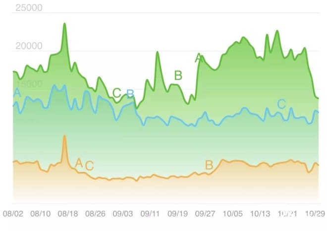 图为Louis Vuitton、Gucci、Chanel三个品牌的百度搜索指数对比,绿色为Gucci,蓝色为Louis Vuitton,黄色为Chanel