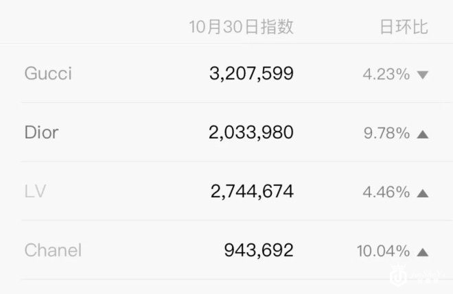 图为Louis Vuitton、Gucci、Chanel三个品牌的微信指数对比