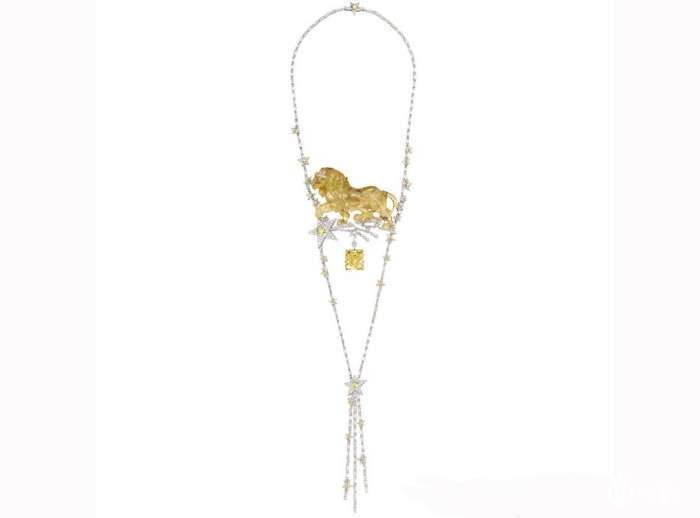 极富巴洛克风格的“Lion Solaire”艳丽迷人,既有钻石的“火光”,亦兼具黄色蓝宝石、黄水晶、绿柱石、黄玉和石榴石的热情璀璨。巧妙而和谐的色调仿如夏末午后的昏黄柔光,配衬宝石的不同形状和款式,设计完美无瑕。“Lion Solaire”包含长项链、胸针、吊坠耳环和戒指。