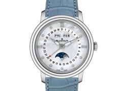 宝珀女装手表采用了圆形银白的珍珠母贝盘上游离着具有硬朗气息的剑型指针,一改宝珀以前使用的优雅柳叶形镂空指针,柔美与刚毅集合于一体风格特色也是兼容在一起的。罗马时标刻度与点点碎钻交相辉映,月份与星期视窗的十二点钟方向对称排列,也体现出宝珀追求平衡与美感的交融。位于六点钟方向的月相显示,可所谓是表盘上的黄金配角,灵动而俏皮的图案使人一眼难忘同时也增加了手表的神秘气息。