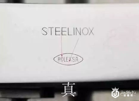 真表的表扣上有劳力士的商标,在“ROLEXSA”字样之下有四个小点。字母“0”下面有一个,字母“X”的左下角有一个,字母“S”“A”的右下角各一个。而假表就没有。