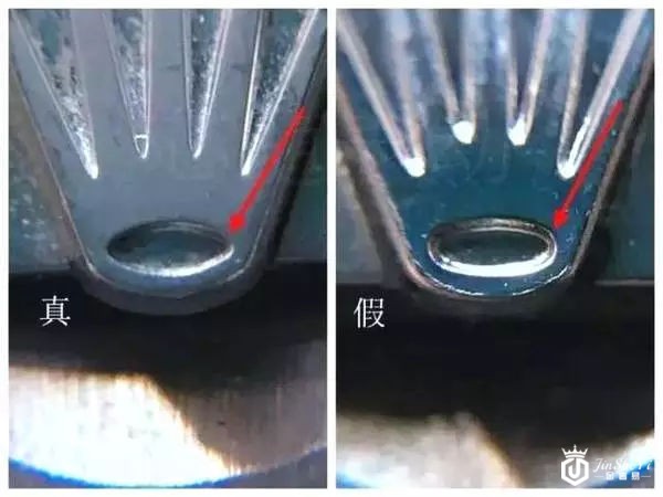 假表表扣上的立体浮雕劳力士皇冠的小嘴巴是“椭圆”的,而真表要尖一点。
