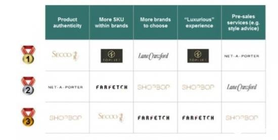 中国奢侈品电商网站寺库(第二名)和京东的奢侈品网站TopLife(第四名)是调查中的两个例外。寺库在“产品真实性”、“总SKU”和“购物便利性”方面表现突出,TopLife在提供单个品牌SKU和“购物便利性”方面表现突出。