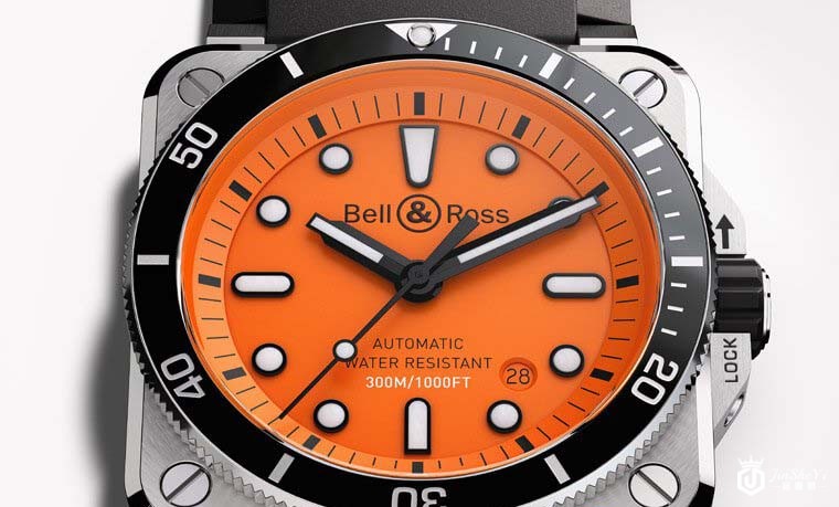 BR方壳潜水表新作名为BR03-92 Diver Orange,很明显这是一款拥有橘色面盘的潜水表!手表此次采用基本的不锈钢表壳,尺寸也还是适中42x42mm,不过这款的黑色表圈是铝材质,并非现在很受欢迎的陶瓷圈,而柏莱士也不忘在表冠周围覆上橡胶材质,用以提升表冠操作时的止滑效果。