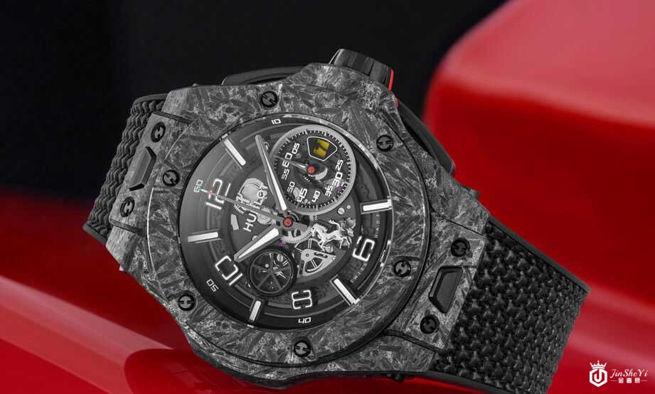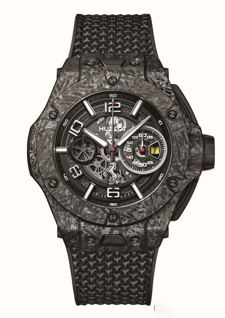 ▲碳纤维陶瓷表壳材质为宇舶与法拉利共同研发,这种材质类似F1赛车的煞车碟盘,具有轻量化且坚固等特性。