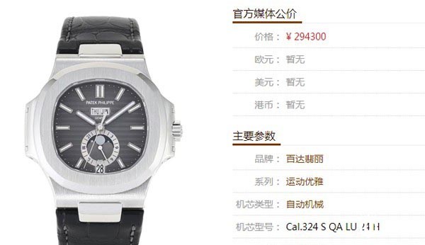百达翡丽鹦鹉螺5726手表市场公价为29.43万元,采用自产的Cal.324 S QA LA 24 H机芯,动力储存45小时,黑色渐变功能表盘,6点钟方向带有月相以及日期显示功能。我们认真对比一下,鹦鹉螺系列钢款腕表只要是钢带的,保值能力都很不错,远超公价表款颇多,当然这款5726虽然为皮质表带,但是它在二手回收市场上的表现也不逞多让。